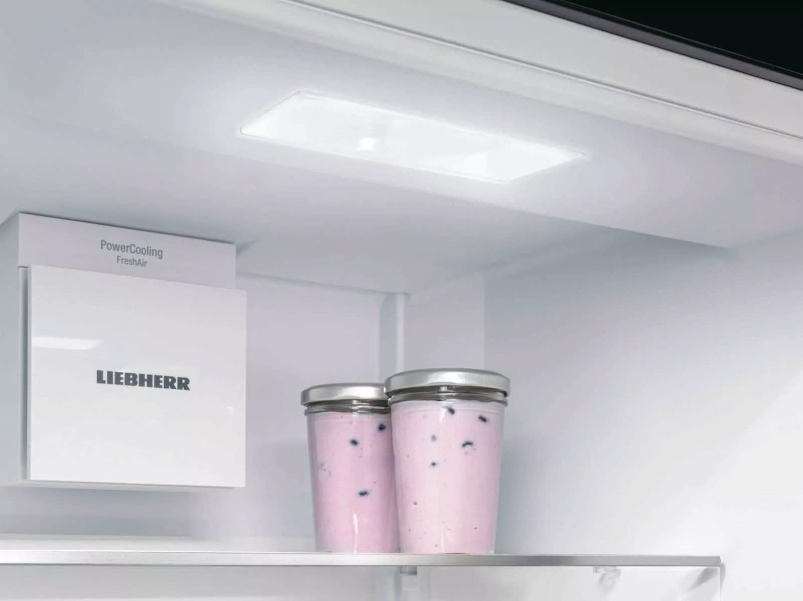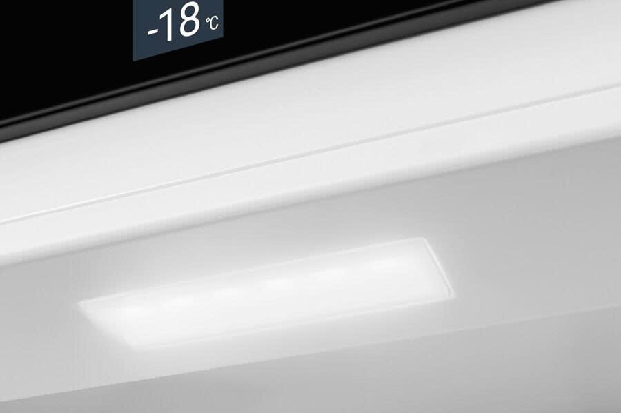 Đèn LED âm trần chiếu sáng nội thất từ trên cao – mang đến cái nhìn tổng quan về thực phẩm. Một điểm nhấn khác: đèn LED được bố trí phía trước các kệ kính, giúp chiếu sáng tốt ngay cả khi tủ lạnh đã đầy.