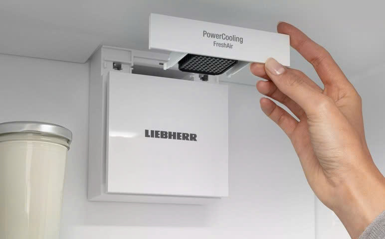 Mùi của một số loại thực phẩm đôi khi không dễ chịu. Tuy nhiên, điều này không thành vấn đề với Liebherr của bạn. Nhờ bộ lọc than hoạt tính FreshAir, bên trong luôn có không khí trong lành. Bộ lọc nằm ngay trên luồng không khí trong vỏ quạt và trung hòa mùi hôi ở mức có thể. Màn hình sẽ nhắc bạn thay bộ lọc.